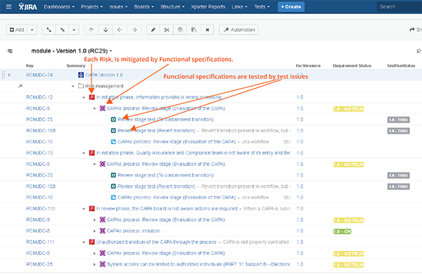 - Generating the traceability matrices: To those who are still using Excel and Word to generate the traceability matrices, I say this: there is hope out there. With the correct tools in place, you can have release documentation only "one click away." The key is to maintain the traceability elements (i.e. user requirements, risks, etc.) in Jira, and use Jira links to represent the traceability. You can then visualize the traceability in Jira and also export your release documentation from Jira. While this does require quite a significant configuration work in Jira and a use of Marketplace apps, the benefits far outweigh the investment. The following are some of my go-to apps to use in this context: